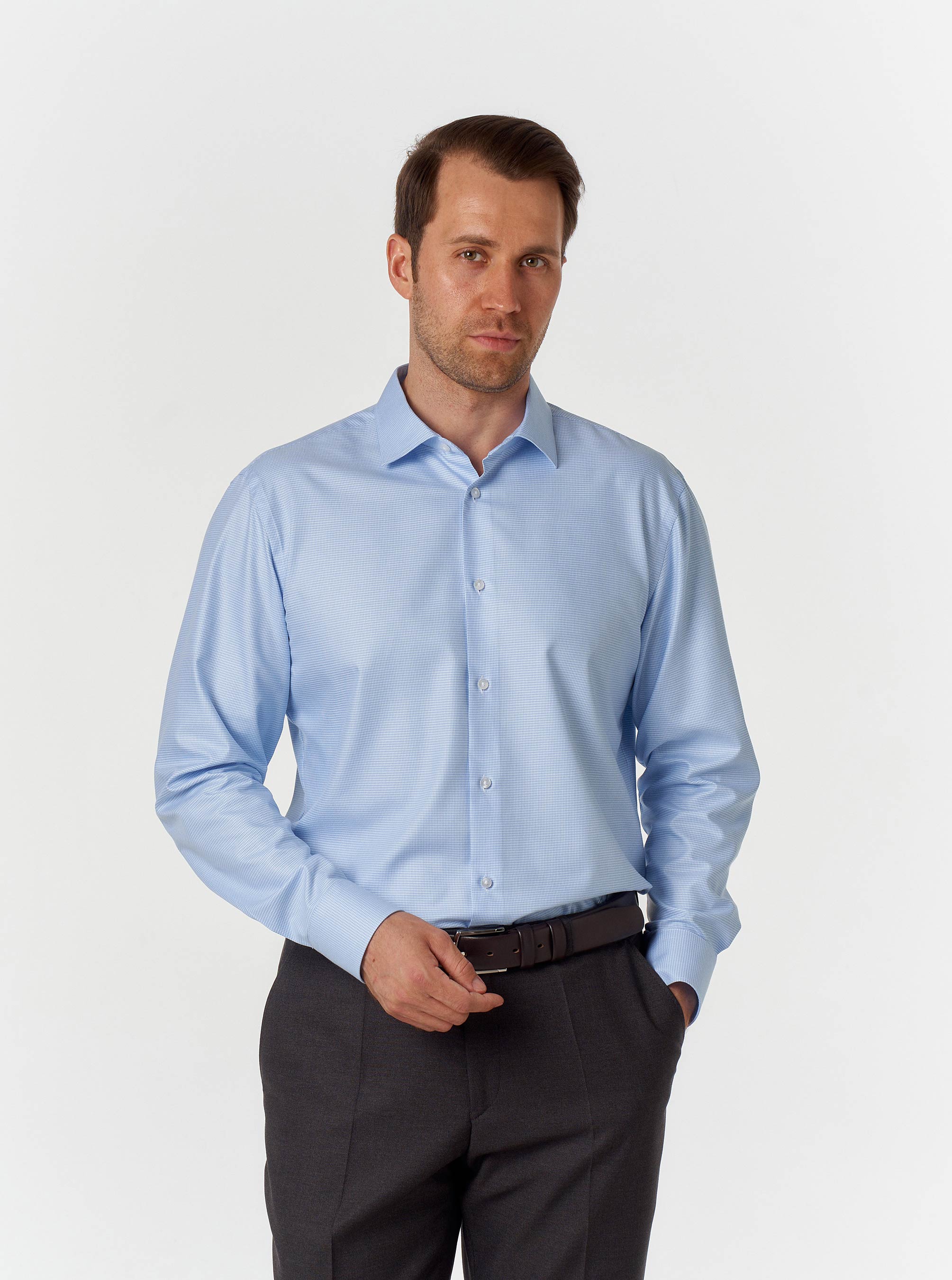 Приталенный вариант имеет заужение по боковым швам в области талии и вытачки сзади, что позволяет рубашке идеально сидеть на фигуре, подчеркивая мужской силуэт.