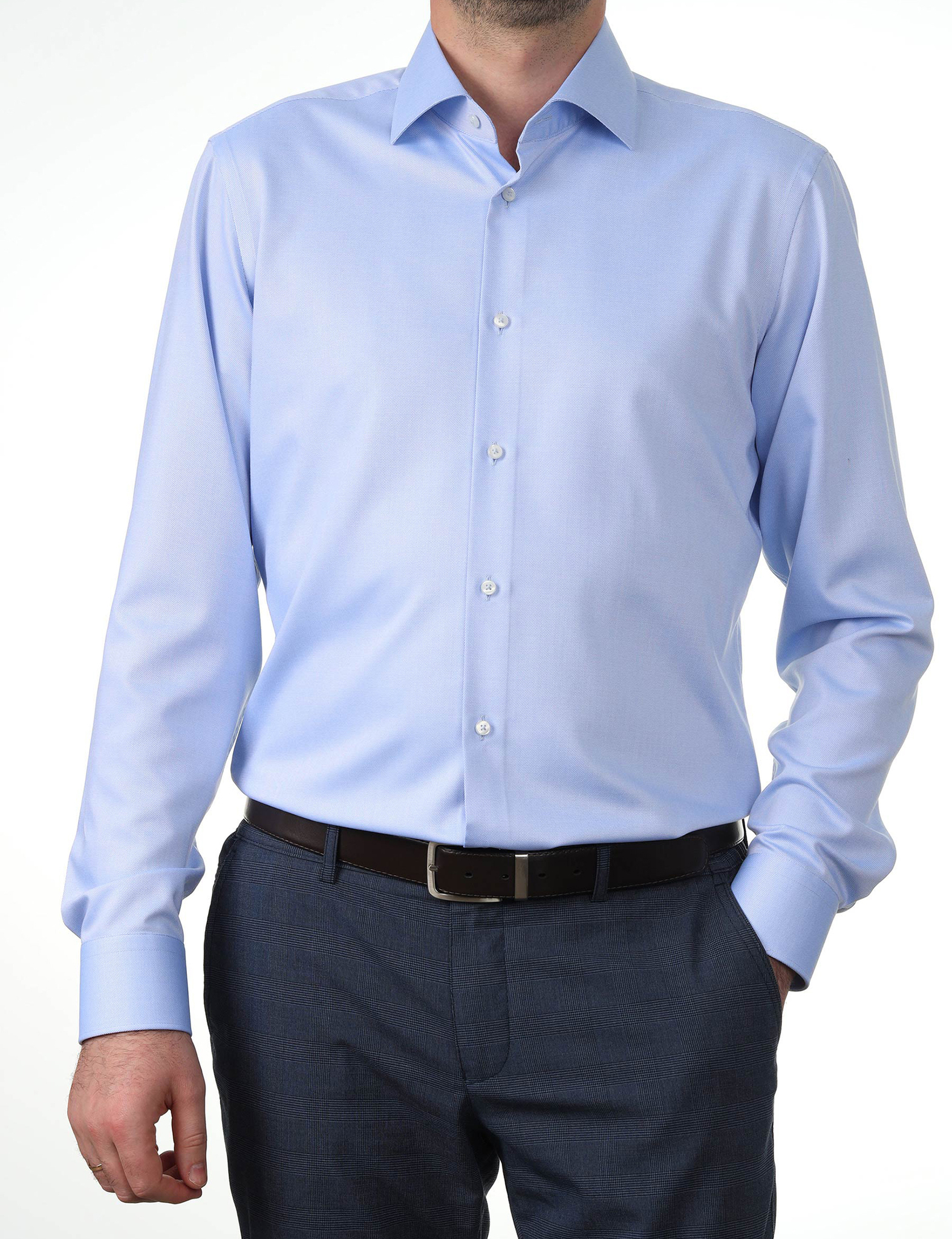 Приталенный вариант имеет заужение по боковым швам в области талии и вытачки на спинке, что позволяет рубашке идеально сидеть на фигуре, подчеркивая мужской силуэт.